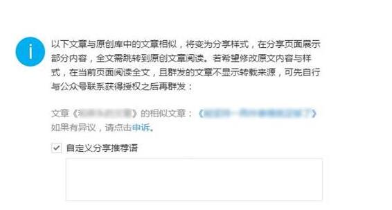 大家應(yīng)該見(jiàn)過(guò)微博的分享,基本跟那個(gè)一樣了,不是你的公眾號(hào)轉(zhuǎn)載了我的文章,而是像微博一樣分享了我的文章。直接上圖: