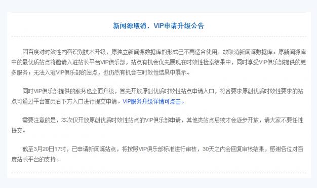 3月20日,百度發(fā)布公告稱將取消新聞源,將實(shí)現(xiàn)時(shí)效性內(nèi)容識(shí)別技術(shù)的升級(jí),將原新聞源數(shù)據(jù)庫(kù)中的優(yōu)質(zhì)站點(diǎn)邀請(qǐng)至VIP俱樂(lè)部。
