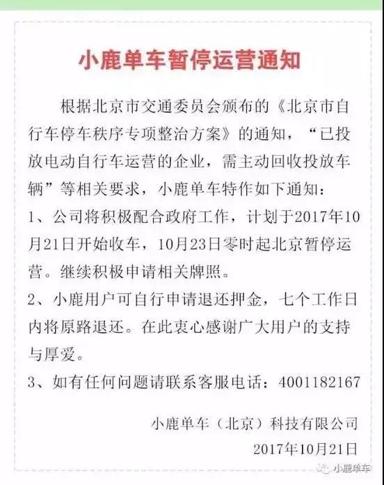 小鹿單車通過官方微信號發(fā)布通知,稱計(jì)劃于2017年10月21日起回收車輛,并將于10月23日暫停運(yùn)營。用戶可自行申請退還押金,7個(gè)工作日內(nèi)將按原路返還。